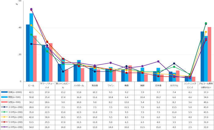 夏のアルコールは「ビール」。男性、50代、60代では5割以上が選択