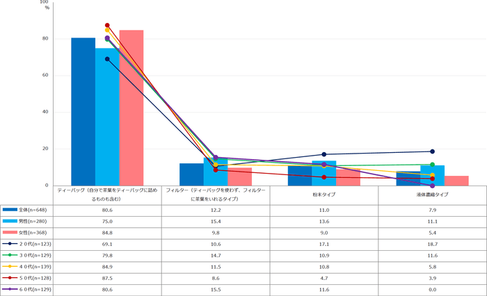 お茶を自分で作っている人に、作り方を聞いたところ、「ティーバッグ(自分で茶葉をティーバッグに詰めるものも含む)」派が8割でした。「粉末タイプ」、「液体濃縮タイプ」は20代で使用している人が多く、「粉末タイプ」は17.1%、「液体濃縮タイプ」は18.7%が使用していると回答しており、いずれも2割近くでした。