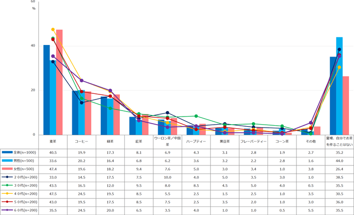 夏の間、自分自身でお茶を作っている人は6割でした。その内、「麦茶」を作っている人は40.5%で最も多くなっていました。