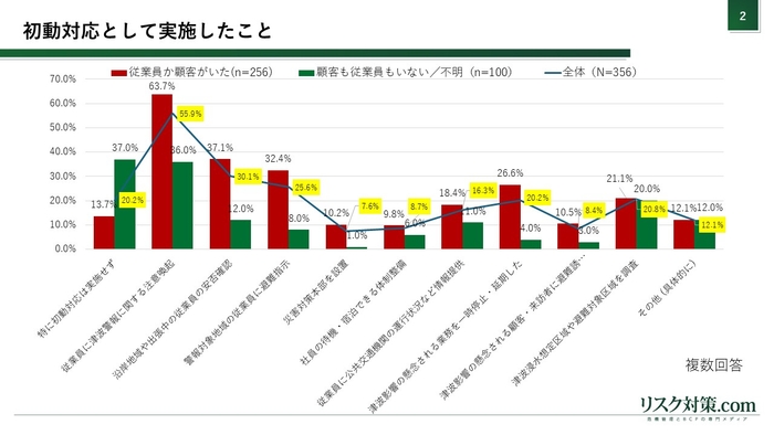 初動対応として実施した行動については、複数選択で回答を得ました。その結果、「従業員に津波警報に関する注意喚起を実施した」が55.9%と最も多く、次いで「沿岸地域や出張中の従業員の安否確認」が30.1%、「警報の対象となった沿岸地域の従業員に避難指示」が32.4%と続きました。