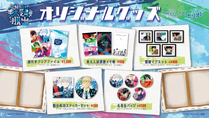 今回、イベントの開催を記念して、本イベント限定のオリジナルグッズ5種の販売が決定! お家に帰ってからも謎解きをお楽しみいただける「謎付きクリアファイル」や、『ブルーピリオド』のキャラクターがデザインされた「脱出成功ステッカー」や「缶バッジ」、各キャラクターの名場面が描かれた「額縁マグネット」も販売。