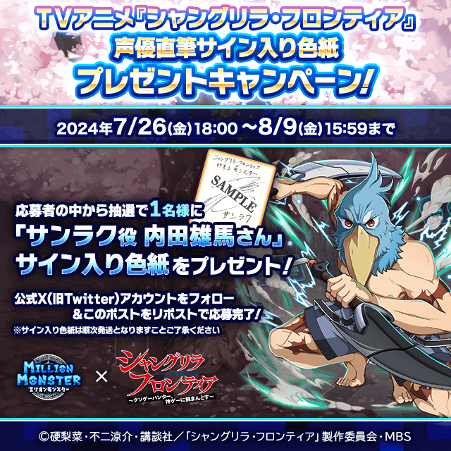 ミリオンモンスターの公式X(旧Twitter)アカウント『【公式】ミリオンモンスター(@mmon_ex)』をフォロー&対象ポストをリポストいただくことでご応募いただけます。サイン色紙プレゼントキャンペーンとの同時応募可能!