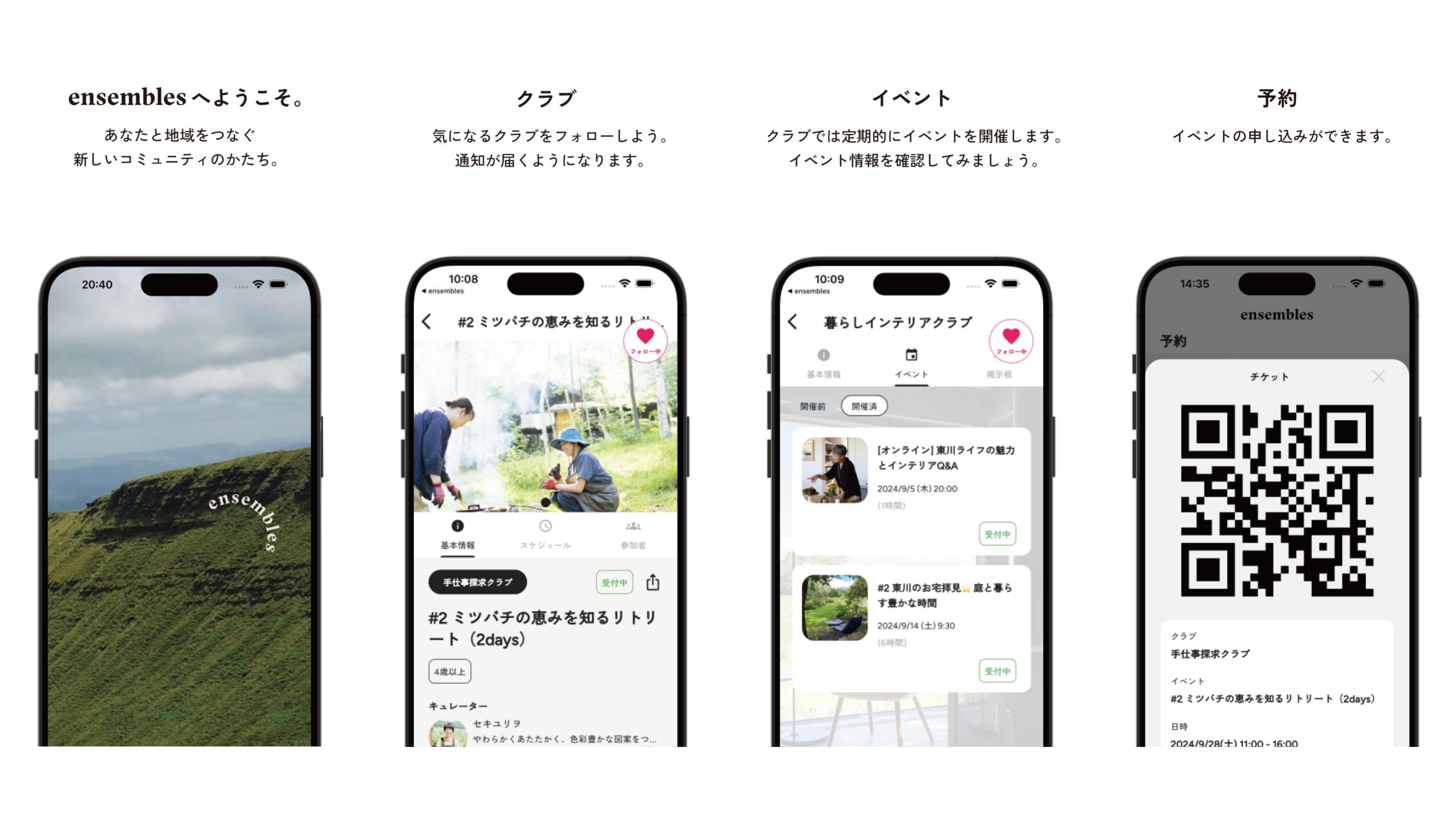 ensemblesアプリは、「もっと暮らす」というテーマを具現化するために設計されました。地域の文化や暮らしに触れ、そこで生まれる人とのつながりを、いつでもどこでも楽しむことができます。