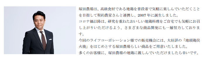 株式会社ライフコーポレーションは11月13 日(土)より、“塚田農場”を展開する株式会社エー・ピーホールディングスの「みやざき地頭鶏炭火焼」・「秘伝の壺味噌」・「鶏皮ポン酢」・「鶏白湯塩煮込み」を、冷凍商品として首都圏ライフ店舗にて販売いたします。