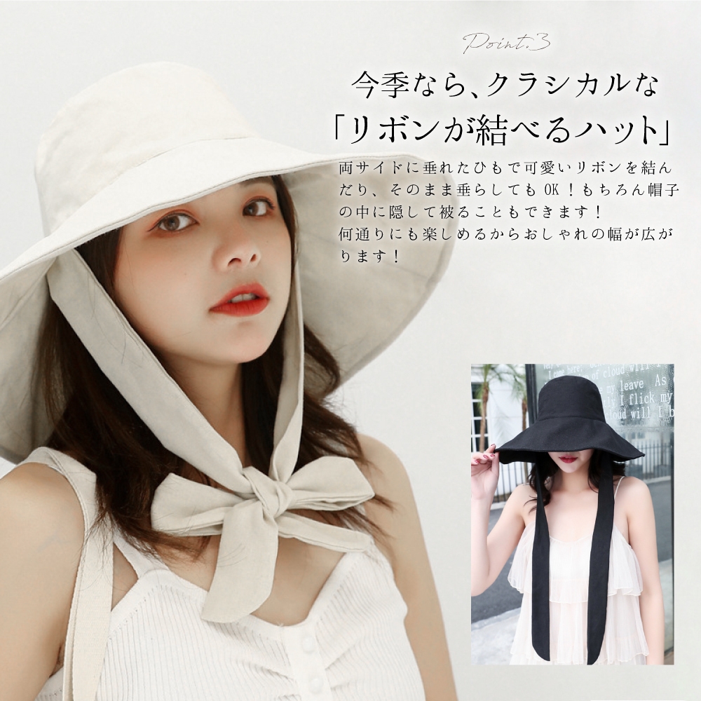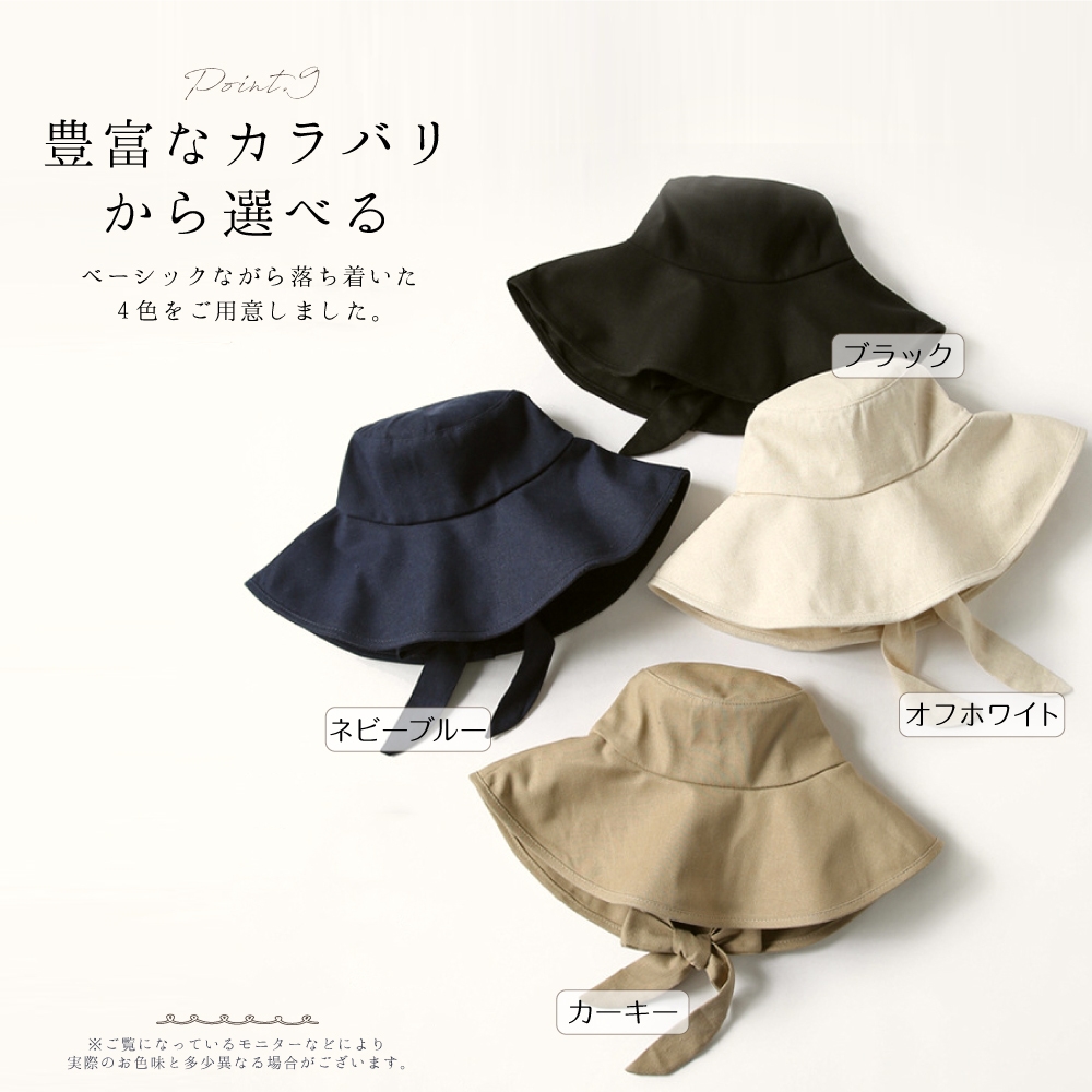 ●帽子の内側両サイドに大き目のリボンがあり、そのまま垂らしたりリボンを結んだりコーデに合わせて楽しめます。