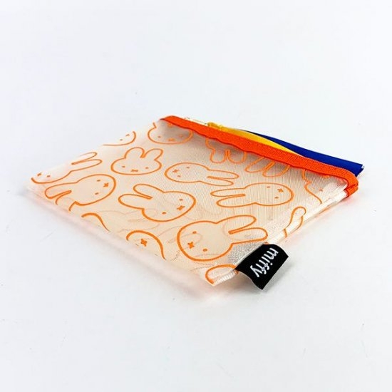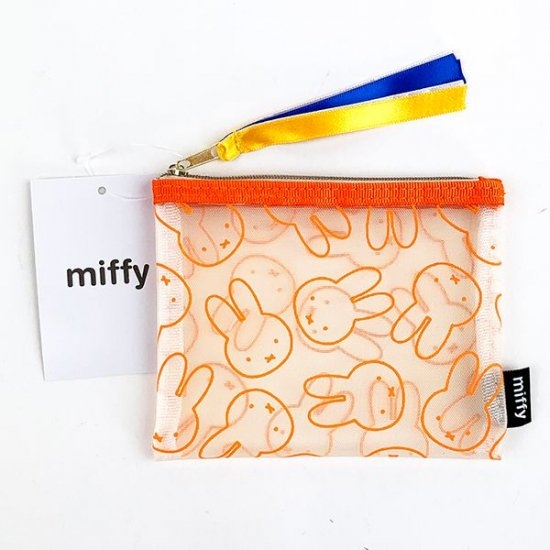 ミッフィーの顔だらけポーチ。青と黄色のリボンが本体のオレンジ色とあわさって元気になれそう♪