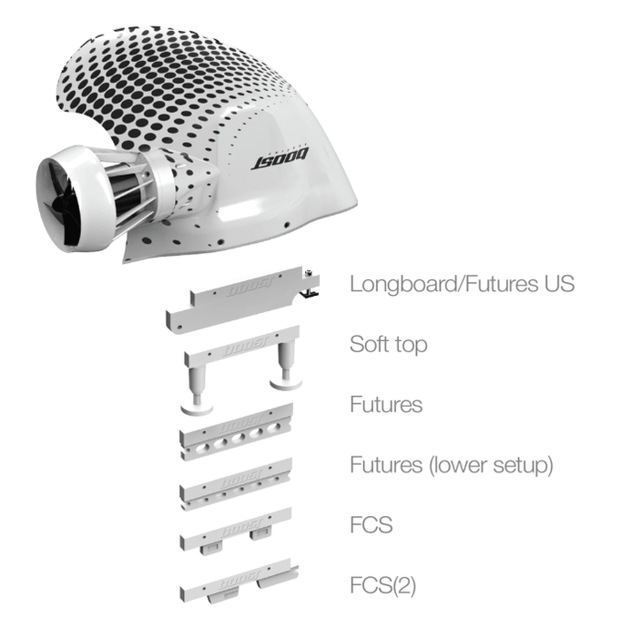 「Boost Fin(ブーストフィン)」の大きな特徴のひとつ、ボードを選ばず接続が可能なこと。多数の専属アダプターが用意されており、取付け、取り外しも簡単。ロングボードでもSUPでも、どんなタイプのボードにも対応可能です。