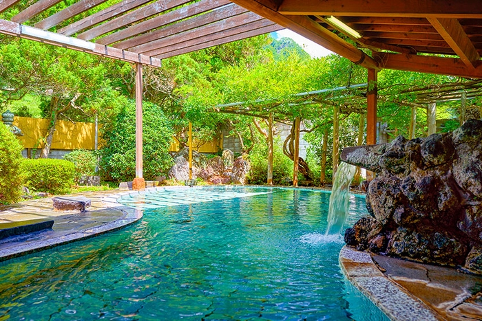 藤館には内湯の他にも、瓢箪型の広々とした浴槽でおもいっきり手足を伸ばして湯あみを楽しむことができる野天風呂・文殊の湯をご用意。