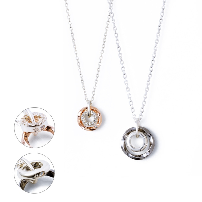 2つのデザインの、それぞれ異なるきらめきが魅力のダブルリングのペアネックレス。
