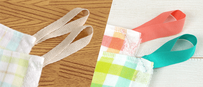 ナチュラルカラーは素材感を残した生成色、ポップカラーは元気な色を採用。また「お洗濯をするとループ同士がくっついてしまう」「こどもが引っかけにくい」というお声から、輪っかスタイルにリニューアルしました。
