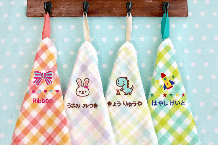 保育園・幼稚園に通うお子さまが使用するお手拭きタオルは、外遊び後や食事前後など良い生活習慣を身につけるために毎日使用されます。毎日洗っていると名前が消えやすく、お名前が小さいと他のお友達の荷物に混ざったり…といろいろなトラブルも起こりがちです。