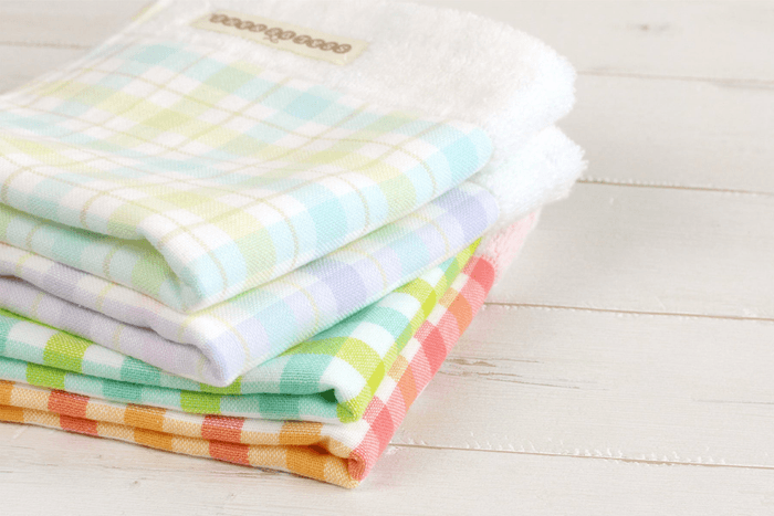 おもては肌に優しいガーゼ生地を採用しました。うらの無撚糸は普通の糸にくらべ、ふんわりやわらかな手ざわりです。繊維のあいだにすき間が多いのでさっと拭くだけでも吸水性が良く、小さなお子さまでも使いやすい生地です。