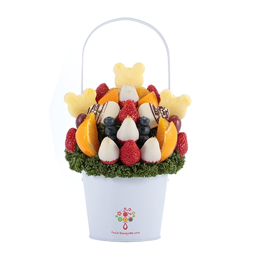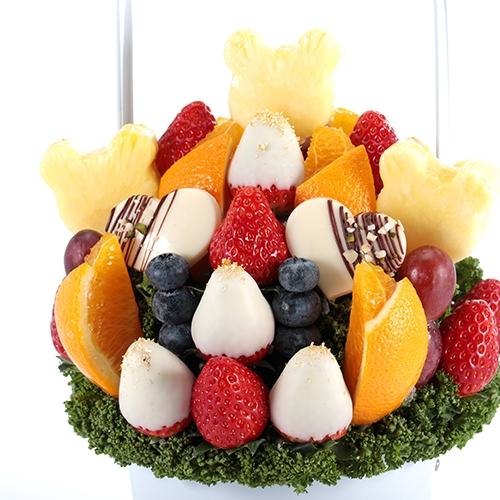 クマ型のパイナップルや、ホワイトチョコでコーティングしたイチゴ、もちろん旬のイチゴもフレッシュにアレンジメントし、女性に喜ばれるデザインに仕上げました。