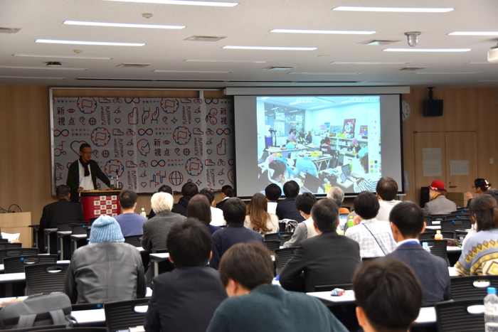 本学人間学部の加藤昌弘准教授は、ゼミで3年間続けているインターネットで音声コンテンツを楽しむ「ポッドキャスト」の取り組みを披露。研究室に収録スタジオを構え、人が集う「リアルな場」で匿名性が高く参加しやすい「無責任体制」と、ユーモアたっぷりに話しました。「学生の保護者やラジオのパーソナリティーが参加したり、企業とコラボできたり」とポッドキャストを通して、新たなつながりが生まれた事例を紹介しました。