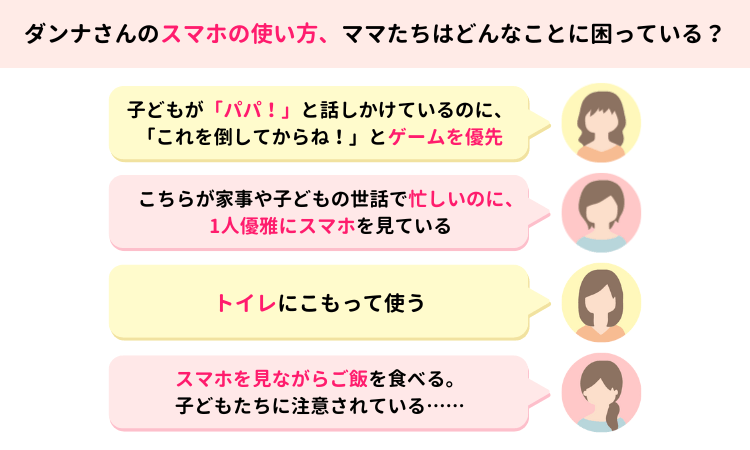当然スマホそのものが悪いわけではありません。大切なポイントは「いつ、どのようにスマホを使うか」ということです。家族の切実な声に耳を傾け、「スマホを使う時間」と「家族と向き合う時間」を意識して切り替えること、家族内でルールやマナーを共有することが、家庭円満のための第一歩になるといえるでしょう。