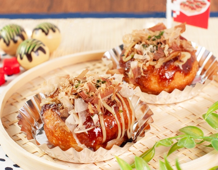 商品特徴:まるで大きなたこ焼き!揚げたもっちり生地とソース・マヨの相性がばっちり。中にはもちろんカットしたタコが入っています。