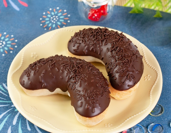商品特徴:ふんわりパンにとろ~り甘いバナナクリームをサンドしてたっぷりチョコをコーティング。お祭り気分満点のスイーツパンです。