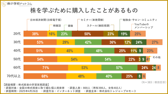 これに対し60代や70代といったシニア層では、学びに対する姿勢は積極的とは言えず、3割を超える人が特に学習することなく株式投資に取り組んでいると回答しています。これには株式投資の経験年数の違いも影響しているのかもしれませんが、年代による傾向の違いがはっきりと出る調査結果となりました。