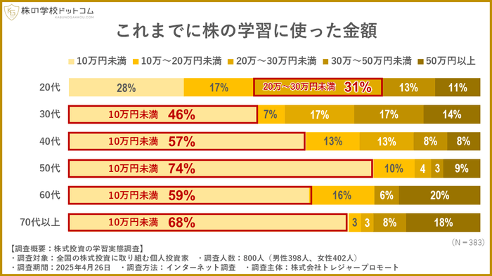 では、それぞれの年代で、株式投資の学習に対してどれくらいの金額を使っているのでしょうか。これについても、20代とそれ以外で異なる傾向が浮き彫りになりました。