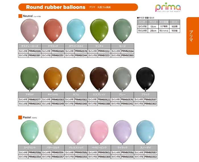 プリマバルーンゴム風船は、5インチ(13cm)、11インチ(28cm)の丸形風船と、バルーンアート用の細長い風船である260Pの3種類を展開。また、カラーバリエーションは60色で、様々なシーンのバルーンデコレーションを可能にしています。(カッコ内のサイズはふくらまし後の長さ)