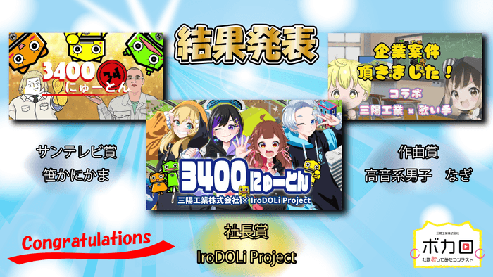 私たち三陽工業は「日本の製造現場を元気にしたい」という想いのもと、様々な取り組みを行っています。ボカロ調の社歌を作ったのもまさにそのため。製造現場のみならず、日本全国に笑顔と元気を届けたいという気持ちをめいっぱい詰め込んで、社歌「3400にゅーとん」( https://youtu.be/tY0XSXJXVlg )を創りました。そして、社歌をより多くの人たちに聴いてもらうため、YouTubeやSNSでの発信、日経社歌コンテストへも出場。しかし、まだまだもっと。たくさんの方に元気を届けるためにはどうすればいいのか。これまでにない新しい方法はないか?そうして決まったのが「ボカロ社歌歌ってみたコンテスト」です。コンテストにすることで、より多くの歌い手さんに笑顔・元気になってもらえるだけでなく、歌い手業界も盛り上げることで、これまでにアプローチできなかった層へ社歌を広めることができると考えたのです。
