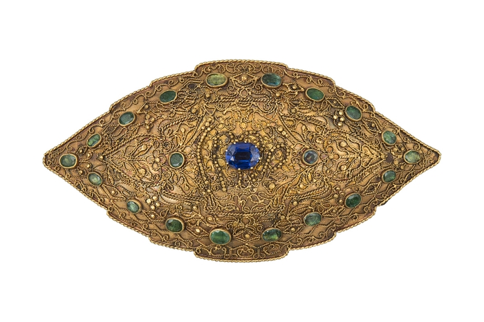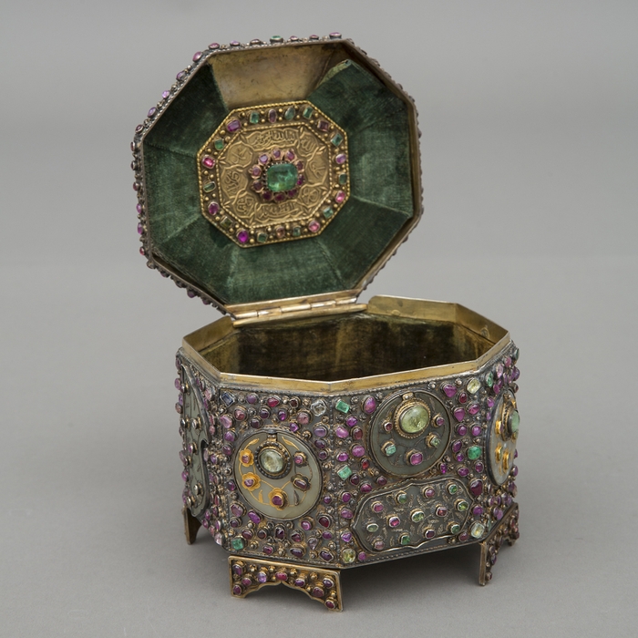 鍍金装飾のほか、ダイヤモンド、ルビー、エメラルドをはめ込んだ小箱で、オスマン朝時代を代表する宝飾品の一つです。