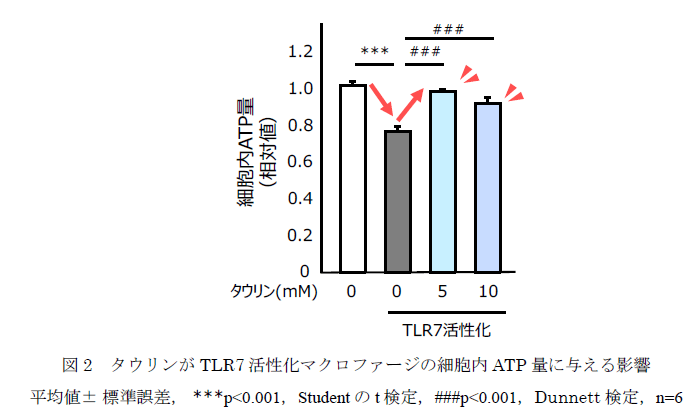 その結果、TLR7活性化による細胞内ATP量の低下は、タウリンによって軽減されました(図2)。