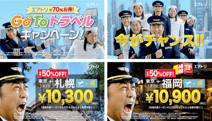 本Web-CMは、現在行っている「Go To Travelキャンペーン×エアトリ特別キャンペーン」について訴求した内容となっており、国内ホテルを予約した場合に実質総額70%割引する特別キャンペーン(※1)、国内ツアーや国内エアトリプラス(国内航空券+ホテル)は実質50%割引になり非常にリーズナブルに旅行を楽しめることを、イメージキャラクターであるロバートの秋山さんとエアトリーヌちゃんが驚きの表情で紹介していきます。また、国内エアトリプラスに関しては具体的な商品価格「東京〜札幌 1泊2日 ¥10,300」「東京〜福岡 1泊2日 ¥10,900」を表記(※2)し、お得な旅行商品の一例を紹介しています。