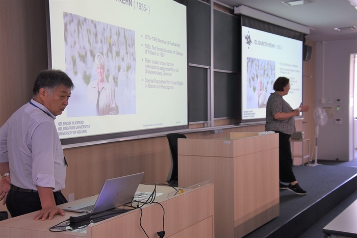 教育学や中国近代史を専門に研究するアイラクシネン准教授は現在、副学部長と学科長、東アジア研究所長も務めており、稲葉教授とアイラクシネン准教授は、稲葉教授がヘルシンキ大学で研究生活を送っていた2006年に出会って以来、交流が続いているそうです。アイラクシネン准教授はこの日、受講する約80人の学生を前に「国際舞台で活躍するフィンランド女性政治家たち」と題して英語で講義しました。