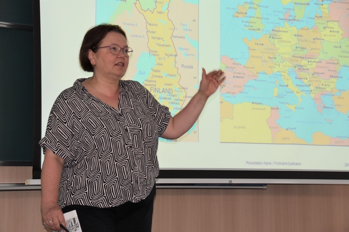 ヘルシンキ大学(フィンランド)人文学部国際文化学科のティーナ・アイラクシネン准教授が5月28日、ナゴヤドーム前キャンパスで行われた都市情報学部の稲葉千晴教授が担当する講義「都市と国際関係」でゲストスピーカーとして登壇し、男女平等の先進国として知られるフィンランドでジェンダー平等を推進してきた女性政治家たちや、男女格差のほとんどないフィンランドの政界や社会の特徴などを解説しました。