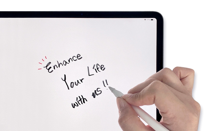 一般的にはペーパーライクフィルムなどを貼付することで摩擦感を発生させていましたが、当製品は特殊なフィルムがない場合も滑ることはありません。iPadの高精細な画面の美しさのまま、Apple Pencilでの快適な作業を実現します。