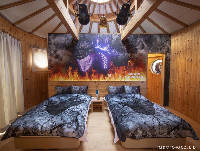 室内には、歴代ゴジラと人気怪獣たちが描かれたインテリアやタペストリー、窓越しに見える実寸大ゴジラの一部、さらに、それらに光の照射で見え方が変わる特殊加工を施すことによって、昼・夜で異なった室内の雰囲気をお楽しみいただけます。室内に隠れた全ての怪獣たちを見つけ出すことで豪華特典が手に入る“特別任務”に挑戦していただくなど、昼夜通してお愉しみいただけるお部屋です。