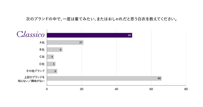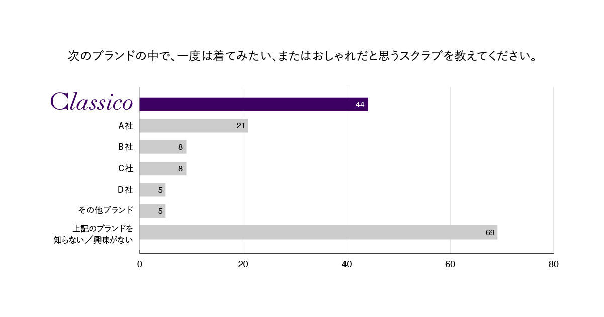 2025年2月に実施した当社アンケート調査(*)では、クラシコが医師から「一度は着てみたい・おしゃれだと思うブランド」の白衣・スクラブで最も多くのお客様からに選ばれました。