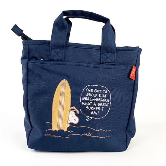 こちらは、以前にもご紹介して好評だった、ボトルインショルダーです。サーフィンをするスヌーピーのイラストが、ネイビー地とよく合っています。