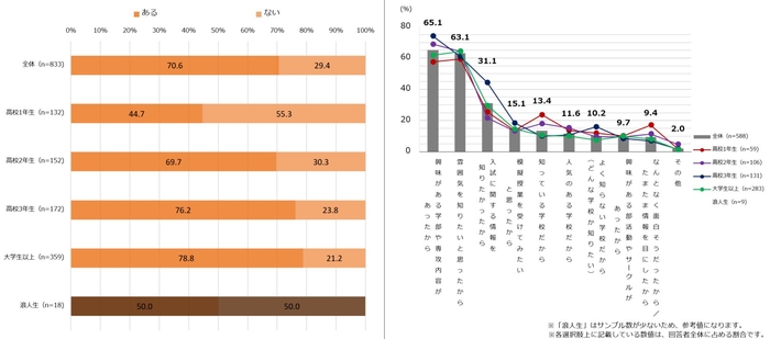学齢別で見ると、受験を終えた大学生以上では78.8%がオープンキャンパスに行った経験があり、高校1年生でも44.7%がすでにオープンキャンパスに行っているということがわかりました。