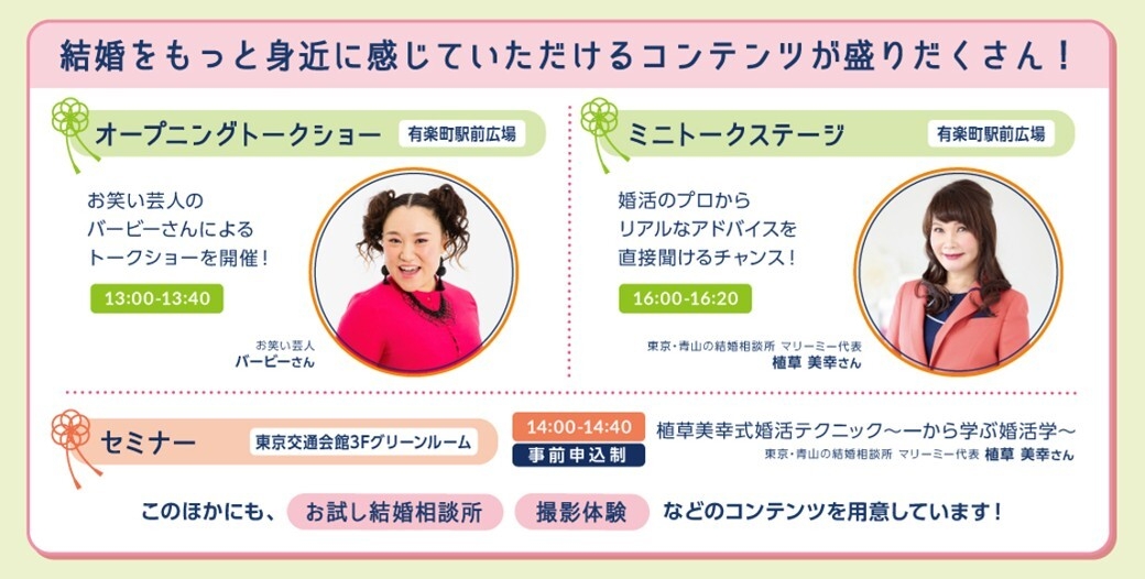 タレントのバービーさんや、婚活アドバイザーの植草美幸さんが参加するステージトークショーのほか、婚活映えするヘアアレンジ体験、プロのカメラマンによる撮影体験、プロの結婚相談所スタッフと直接話せるお試し結婚相談所、婚活アドバイザー植草美幸さんと、メディアにも多数出演している婚活コーディネーター荒木直美さんの2名からのアドバイスメッセージがもらえるカプセルコーナーなど、様々な企画を実施します。
