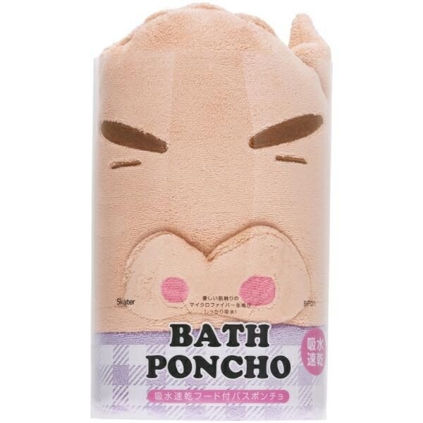 クレヨンしんちゃんのフード付きバスポンチョ。被るだけで可愛いキャラクターになりきれ、吸水速乾と機能性も抜群です。