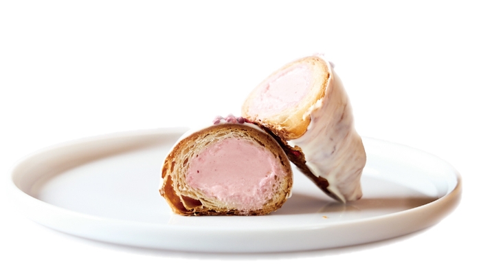 甘酸っぱいフランボワーズクリームをたっぷり詰め込み、周りをホワイトチョコレートでコーティングしました。パリっとしたホワイトチョコに、バター香るクロワッサン、ふわふわのフランボワーズクリーム…それぞれの食感と味わいの「妙」も楽しい一品です。