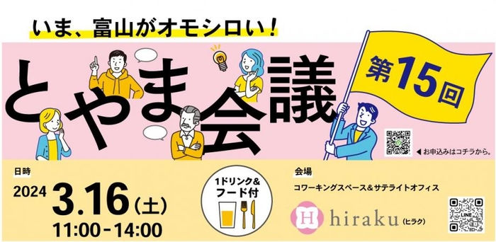 富山の面白いヒトやコトに出会える「とやま会議」vol.15を、3月16日(土)11時から、コワーキングスペース&サテライトオフィス「hiraku」(富山市丸の内)にて開催しました。