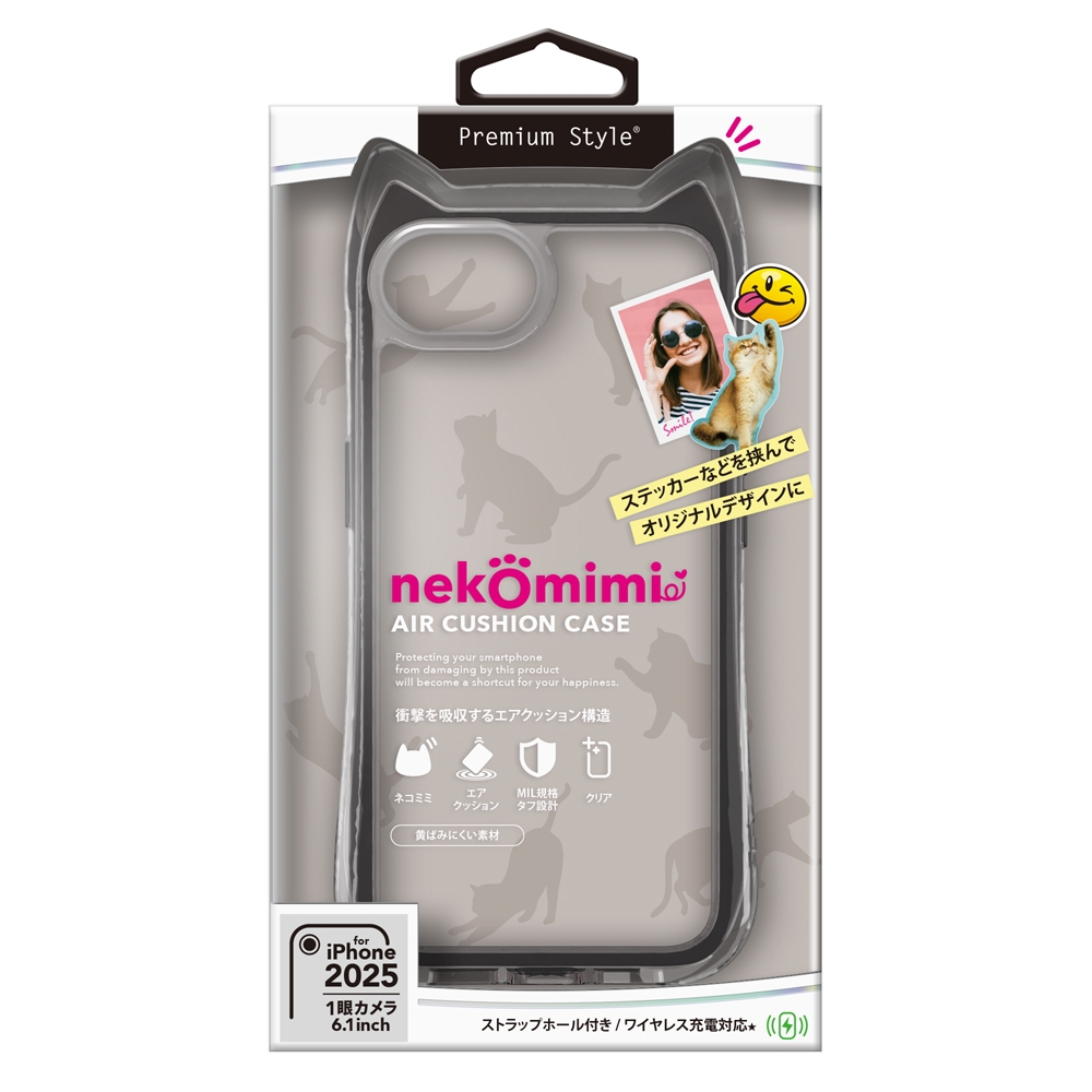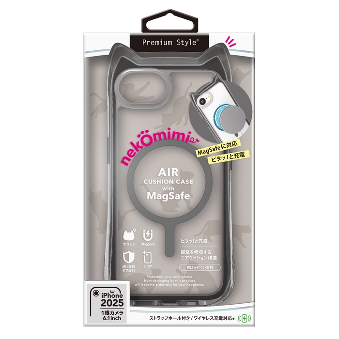 可愛らしい猫耳デザインの各種MagSafeアクセサリーに対応したiPhone 16e 用 ネコミミ エアクッションケースです。側面のTPU素材が2層構造で内側は硬質なTPU素材でiPhone本体をしっかりとホールド、外側は柔らかなTPU素材で手にフィットしやすく、外部の衝撃からiPhone本体をしっかり護ります。背面は、薄くて耐久性に優れたポリカーボネイトを採用し、iPhone本来のデザインを活かすクリアタイプ。シールや写真を入れて自分好みにカスタマイズすることが出来ます。メタルリング搭載でMagSafeアクセサリーをピタッと簡単装着。米国国防総省の軍用規格(MIL-STD-810G)の落下と振動試験をクリアしたタフ設計。お手持ちのストラップをつけて落下を防げるストラップホール付き。