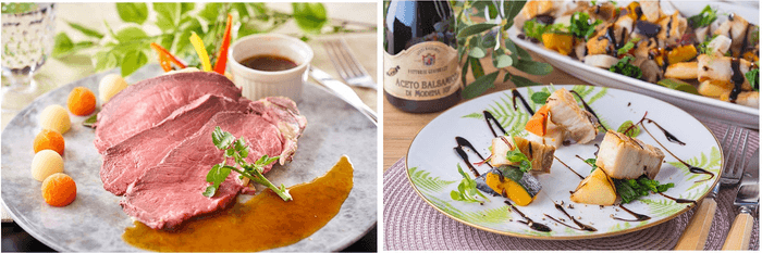右:期間限定メニューの豚バラ肉のクロカンテ。柔らかく煮込んだ後、表面をカリっと焼き上げて旨味を閉じ込めた豚バラ肉にバルサミコ酢を使った酸味の効いたソースが好相性。