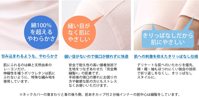 「メディキュア」は、QOL(クオリティ オブ ライフ)向上への貢献を目指し、医師、看護師、患者さまのお声をもとに手術後などデリケートなお肌をサポートする肌着として開発しました。