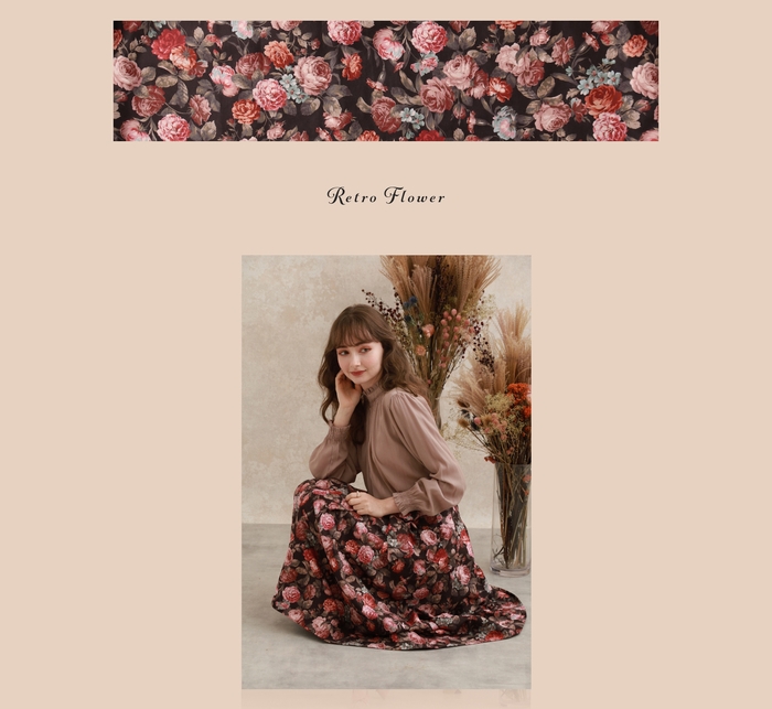 最新コレクションでは、オリジナルのレトロフラワー柄やチュール等の華やかなスカートをメインにしたスタイリングやどこか懐かしいコーデュロイ素材のレトロフラワー柄のフィットアンドフレアワンピース、パールやリボンモチーフがアイキャッチーでディテールにもこだわったトップスやカーディガンなどをバリエーション豊かに展開いたします。