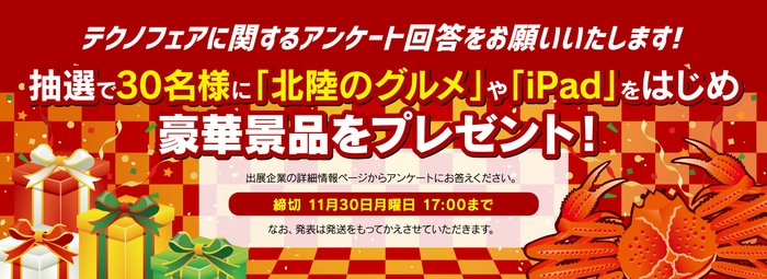 来場者登録(無料)を済ませ、アンケートにお答え頂いた方の中から抽選で30名様に、「冬の絶品北陸グルメ」や「iPad」などの豪華景品をプレゼント致します。北陸のテクノロジーを体感し、美味しい北陸の味覚もゲットしましょう!