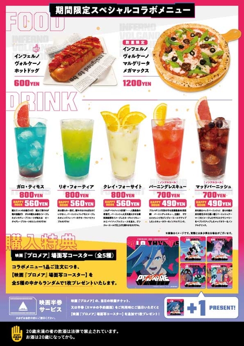 ・来店日当日の映画『プロメア』半券を提示いただくと、上記コラボメニュー1品ご注文時に非売品の場面写コースター(全5種)を、もう1枚プレゼント(通常時1枚→半券提示時2枚)