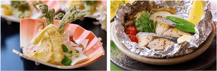 右:サワラをハーブと一緒にホイル焼きに。ホイルを開けた時に立ち昇るハーブの爽やかな香り、ギュッと閉じ込められた食材の旨味をシンプルにお楽しみください。