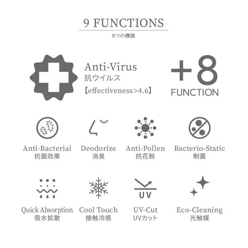 「抗ウイルス」「抗菌防臭」「消臭」「抗花粉」「制菌」「吸水拡散」「接触冷感」「UVカット(遮熱)」「光触媒(エコクリーニング)」の9つの機能※が付与された、清潔仕様の洗えるマスクです。
