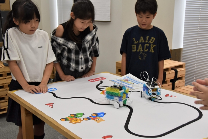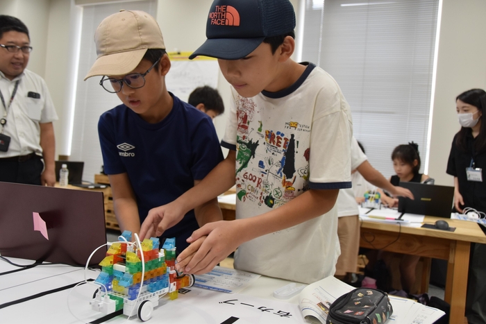 続いて、ブロックを使いながら黒い線の上を走らせるロボット作りに挑戦しました。ブロックに車輪やモーター、指示を出すボードコンピュータやバッテリー、センサーなどを取り付け、色とりどりのブロックでオリジナルのマシンを組み上げました。