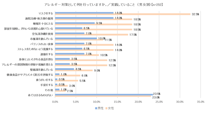 またこのアレルギー対策の積極性の面では男女の差が見られました。「バランスのよい食事」が男性7.0%に対し女性14.0%、「身体によいとされる食品を摂る」男性3.5%:女性12.5%、「ストレスをためないよう意識する」男性6.5%:女性14.5%など、女性の意識の高さが判明しました。