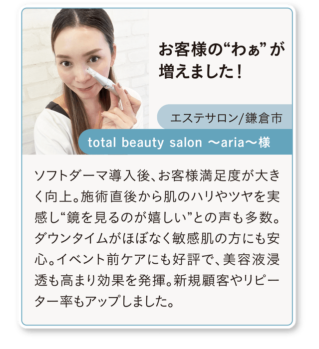 エステティシャンにとって使いやすく安全性も高く、お客様にとっては痛みやダウンタイムが少ないことが評価されています。